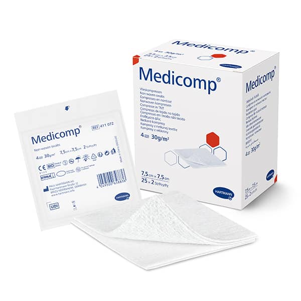 Нетъканите стерилни компреси Хартман Медикомп са подобни на структура, като марлените тампони. Те са изработени от 70% вискоза и 30% полиестерни влакна. Не съдържат свързващи вещества и избелващи агенти. Имат висока степен на абсорбция, меки и въздухопропускливи. Предназначени за общо лечение на рани. Могат да се ползват като тампони или като допълващ превръзката компонент. Четири-пластови, не отделят влакна, не залепват за раната и са хипоалергенни. Предлагат се в опаковка от 25х2 бр.
