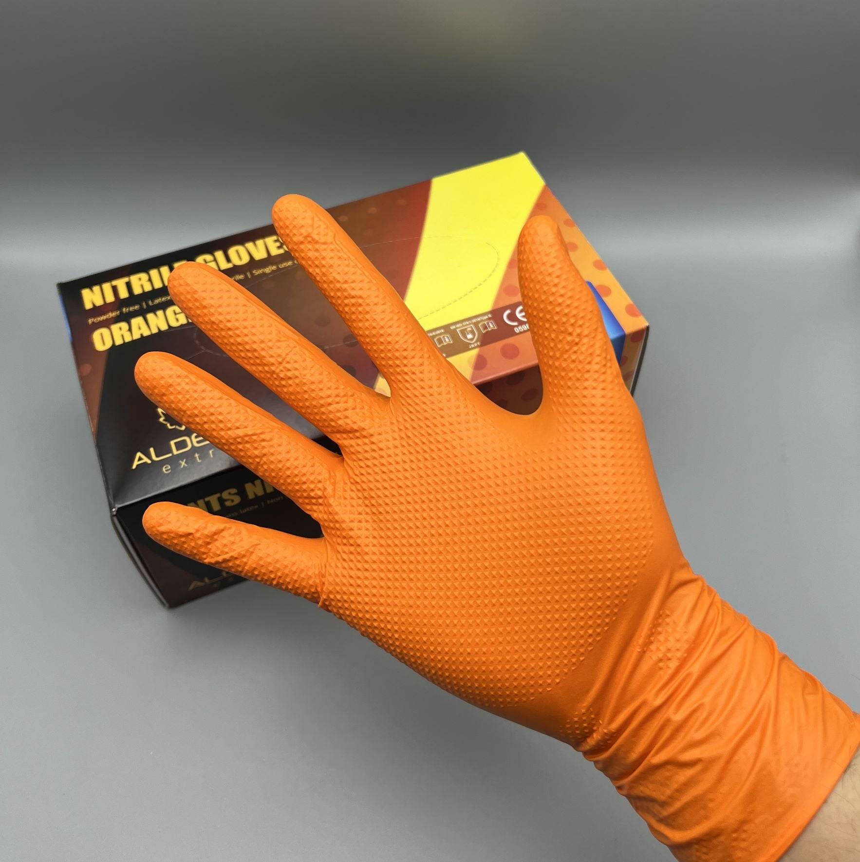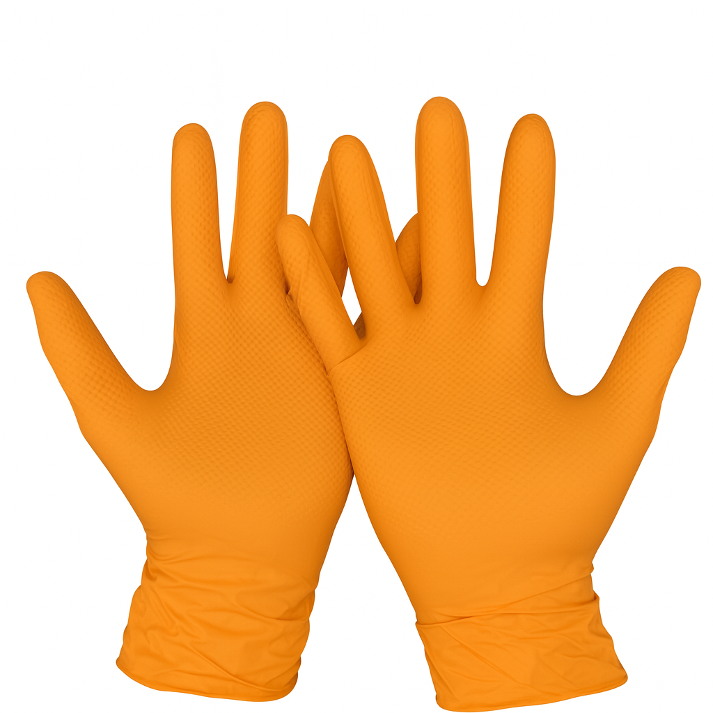 Започни да следиш ценатаОранжеви нитрилни ръкавици ALDENA 8 гр – 50 бр. Индустриални ръкавици с диамантена текстура за сигурен захват. nitrile gloves orange ALDENA, здрави, химически устойчиви, без пудра и латекс, професионални ръкавици.